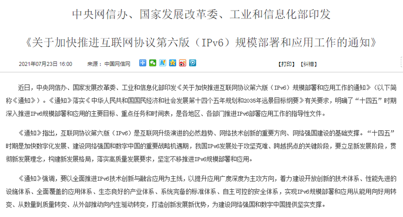 近日,中央網(wǎng)信辦、國家發(fā)展改革委、工業(yè)和信息化部印發(fā)《關(guān)于加快推進(jìn)互聯(lián)網(wǎng)協(xié)議第六版(IPv6)規(guī)模部署和應(yīng)用工作的通知》(以下簡稱《通知》)。《通知》落實(shí)《中華人民共和國國民經(jīng)濟(jì)和社會(huì)發(fā)展第十四個(gè)五年規(guī)劃和2035年遠(yuǎn)景目標(biāo)綱要》有關(guān)要求,明確了“十四五”時(shí)期深入推進(jìn)IPv6規(guī)模部署和應(yīng)用的主要目標(biāo)、重點(diǎn)任務(wù)和時(shí)間表,是各地區(qū)、各部門推進(jìn)IPv6部署應(yīng)用工作的指導(dǎo)性文件。《通知》指出,互聯(lián)網(wǎng)協(xié)議第...