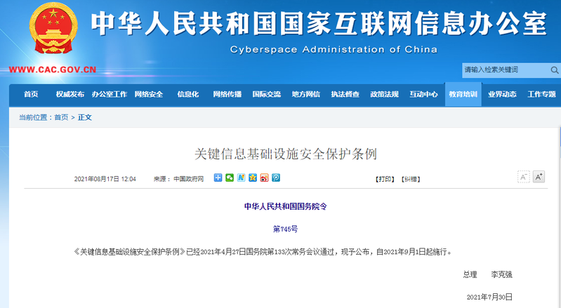 中華人民共和國國務(wù)院令第745號《關(guān)鍵信息基礎(chǔ)設(shè)施安全保護(hù)條例》已經(jīng)2021年4月27日國務(wù)院第133次常務(wù)會(huì)議通過,現(xiàn)予公布,自2021年9月1日起施行。總理 李克強(qiáng)2021年7月30日關(guān)鍵信息基礎(chǔ)設(shè)施安全保護(hù)條例第一章 總 則第一條 為了保障關(guān)鍵信息基礎(chǔ)設(shè)施安全,維護(hù)網(wǎng)絡(luò)安全,根據(jù)《中華人民共和國網(wǎng)絡(luò)安全法》,制定本條例。第二條 本條例所稱關(guān)鍵信息基礎(chǔ)設(shè)施,是指公共通信和信息服務(wù)、能源、交...